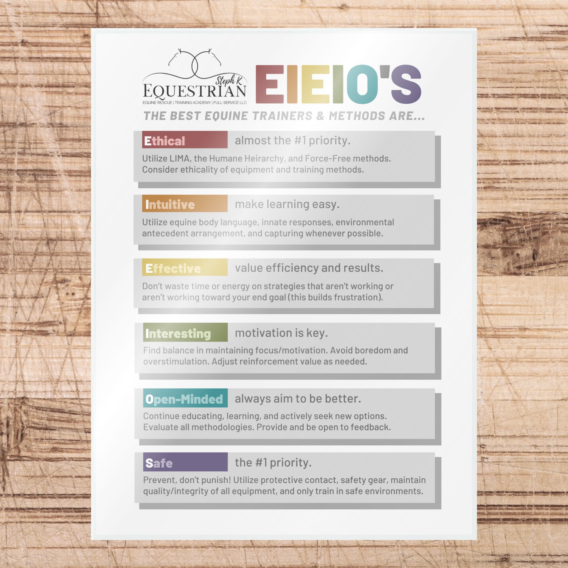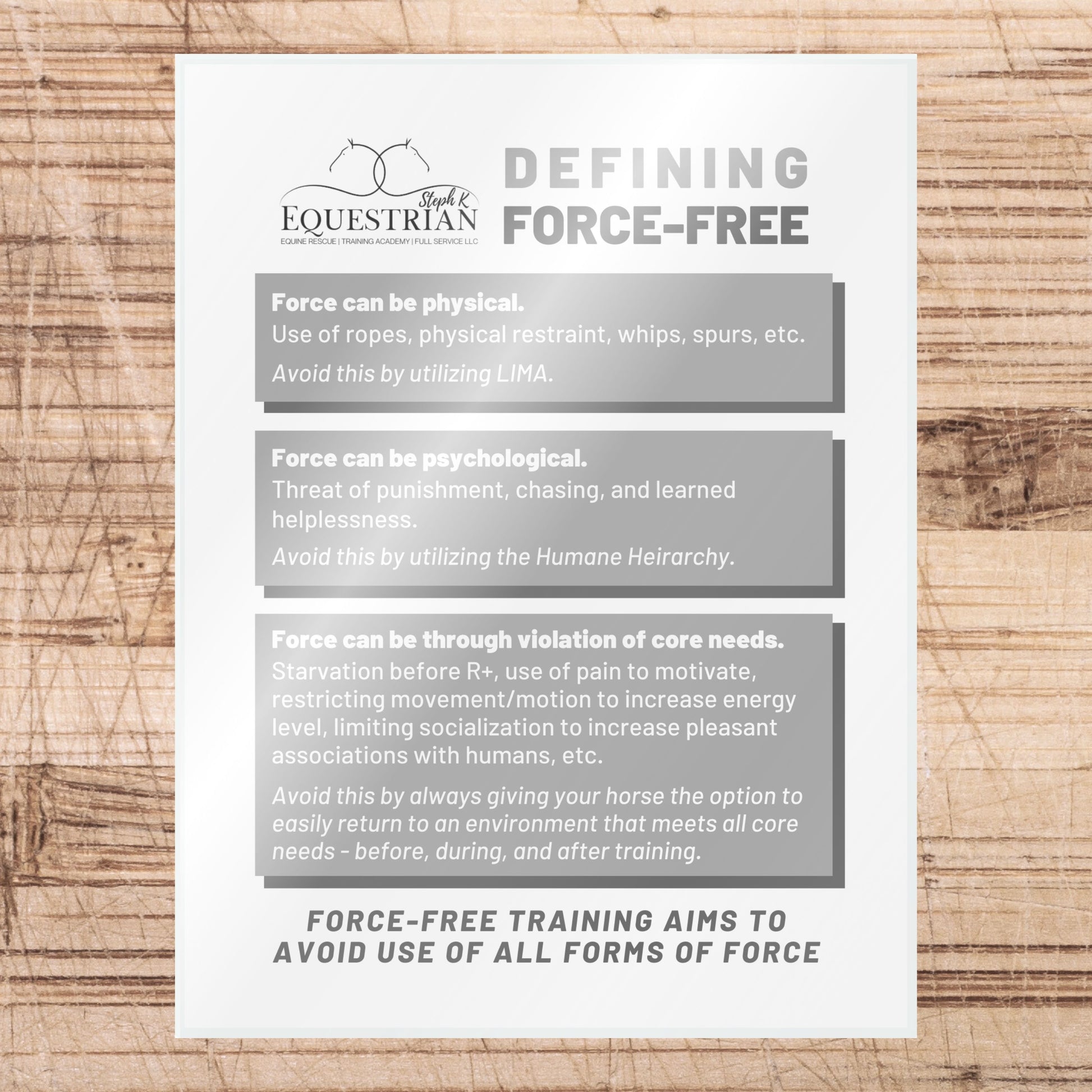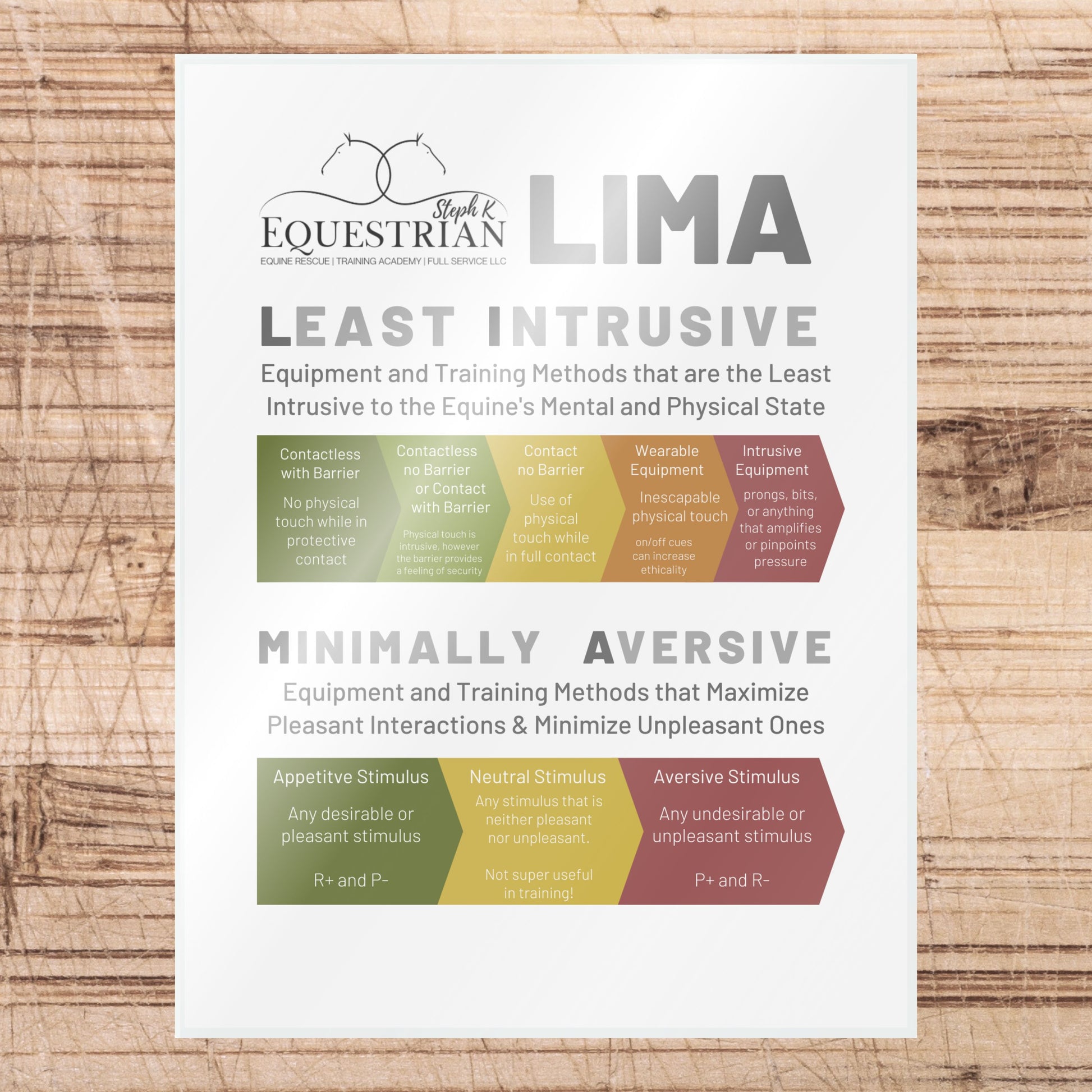 SKE is committed to always improving, staying open to new ideas, and continuing our education. We regularly update our equine educational resources to reflect this, including these placards. Our older designs are also available for purchase at substantially discounted rates.